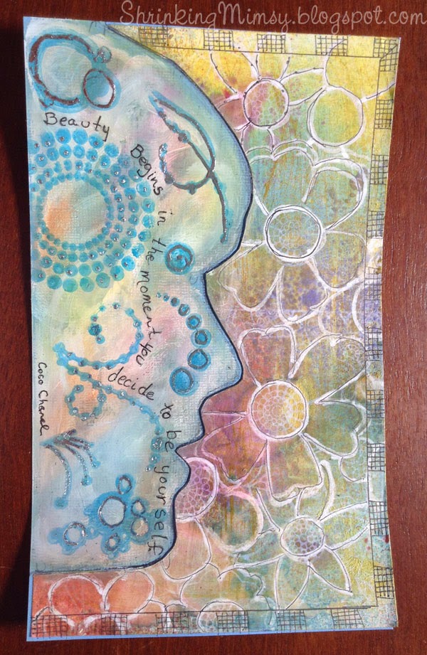 I had so much fun with this one! Another premade Dylusions background, toned down with gesso and Gelatos and stamped with Picket Fence Distress Paint. I used a stencil that I cut with my Silver Bullet Professional cutter to mark a face from the left edge of the background, and cut it by hand. I mounted it on a piece of cardstock, and started adding more layers. Lots of Gelatos and white acrylic paint here. I outlined the face with charcoal pencil and stamped it with Archival ink. For a finishing touch, I used a glue pen to add some foil touches to the stamps on the face They look black or grey here, but in real life, they are a beautiful silver. I made a border with my Sharpie pen, and highlight some of the flower details as well. Finally, I added a handwritten quote.